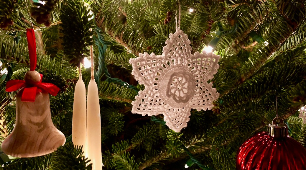 Evenings and we lay under the tree, fanned out like spokes in a wheel, the room dark but for the tree lights, as we discussed with great solemnity, the existence of you-know-who. My brother, Billy, and I were old enough to have seen price tags left of toys the year before: W.T. Grant, Kuester’s, Sears & Roebuck. This required an elaborate series of events to explain, ones involving managers late on Christmas Eve letting Santa in the backdoor. We accepted the logic that he couldn’t carry all the toys for the world at once, while still accepting the fact that Santa delivered toys by sleigh.